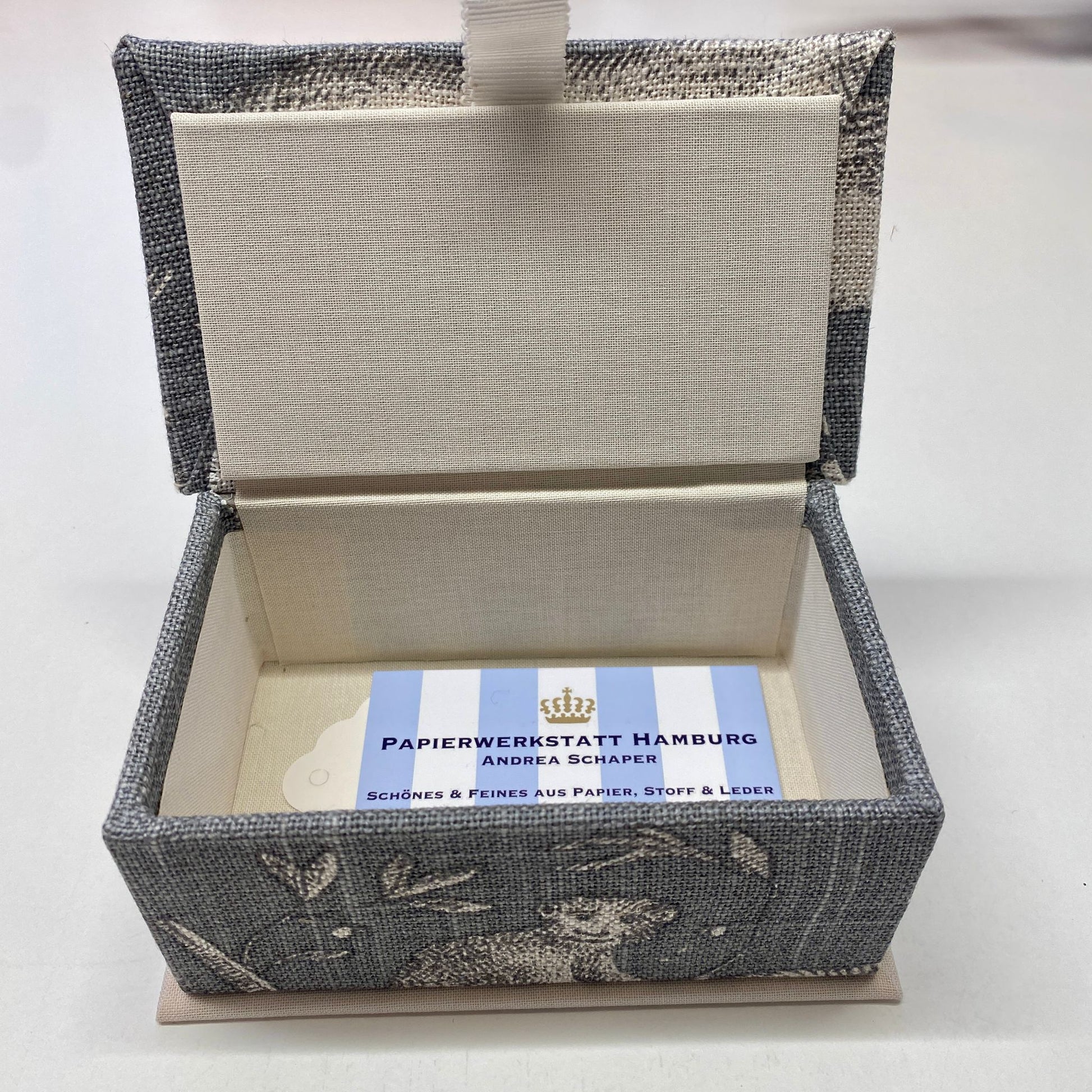 Diese Taschentücherbox bringt Stil in jeden Raum – vom Nachttisch bis zur Küche. Handgefertigt mit hochwertigem Stoff von André Martin, besticht sie durch cremefarbenes Buchbinder-Leinen im Inneren und elegantes Rips-Band als Verschluss. Das zeitlose Design passt perfekt ins Bad, ins Büro oder den Flur und macht das Griffbereit-Halten von Taschentüchern zur stilvollen Gewohnheit.
