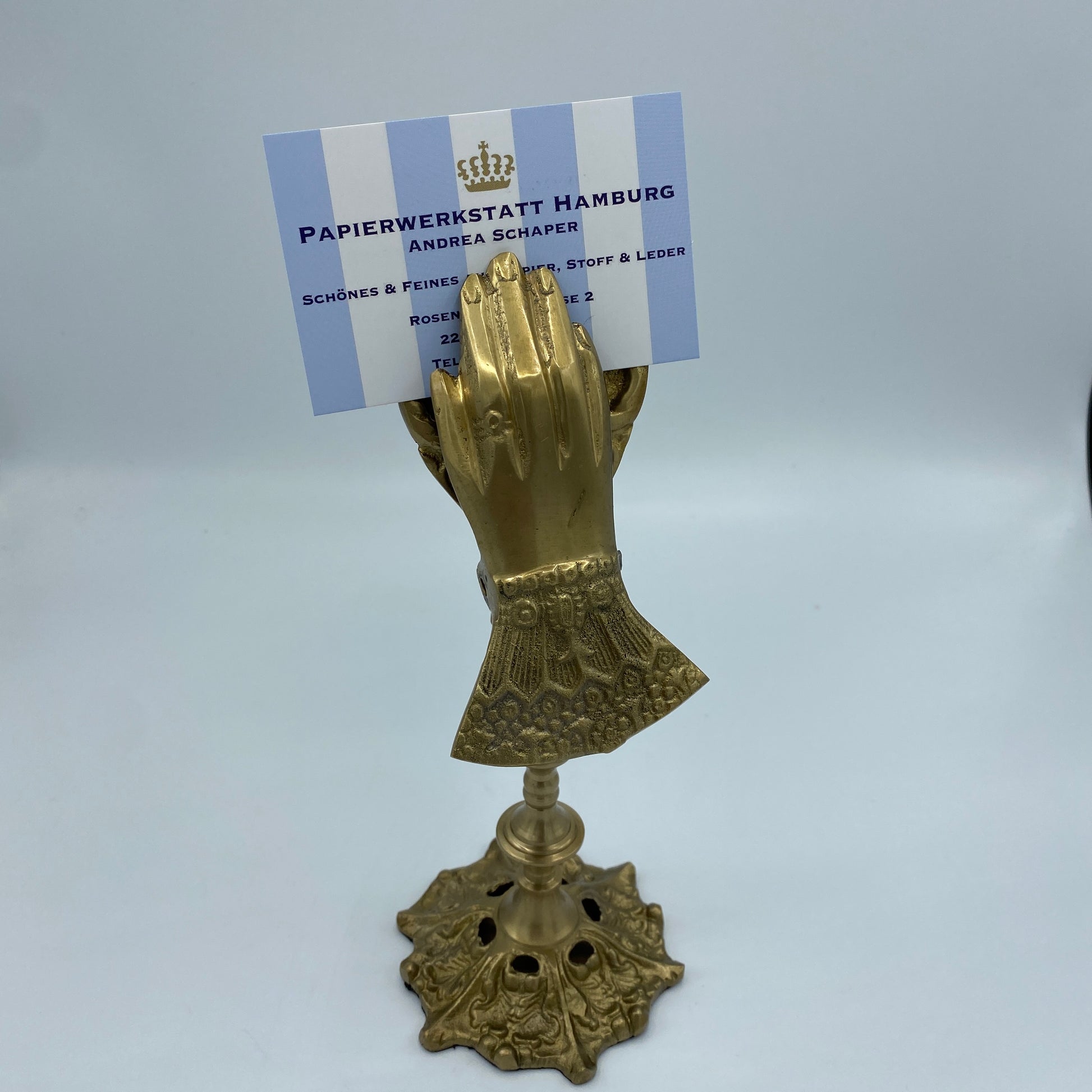 Diese elegante Hand aus Messing hält Ihre Zettel, Kassenbons oder Quittungen zusammen. Die Klemme ist auf einem schweren Ständer befestigt, so dass Sie Ihre Erinnerungen im Blick behalten. Man kann sie auch Rezepthalter nehmen, für Konzertkarten....lassen Sie sich etwas einfallen. Schön ist sie auf jeden Fall!