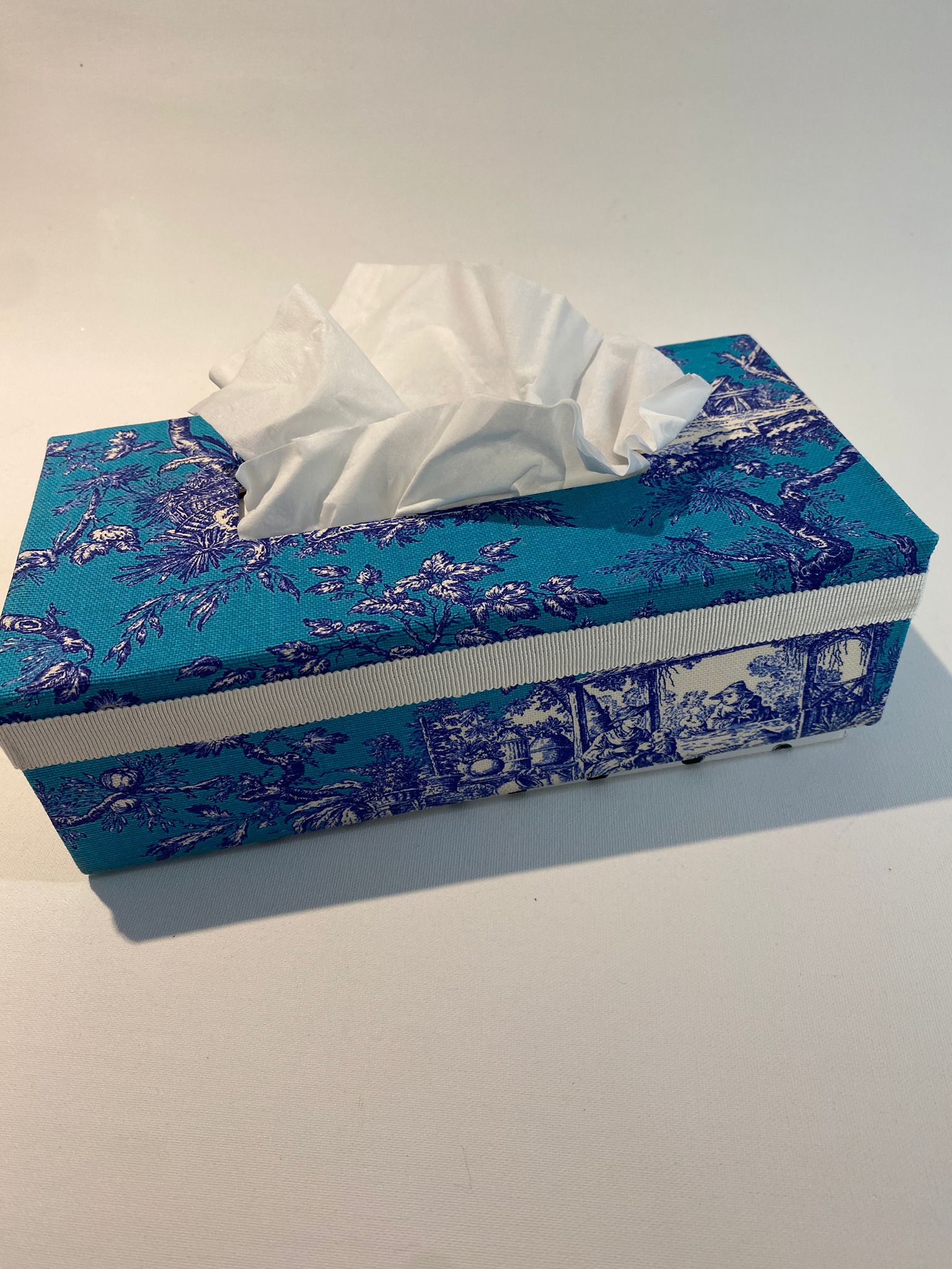 Kosmetiktücher braucht man immer wieder: wie schön, wenn man eine Box als Spender hat, die dazu auch noch elegant aussieht. Diese ist mit einem klassischem mittelblau/türkisfarbenem Toile de Jouy-Stoff bezogen. Ideal für Bad, Küche oder WC – und immer wieder neu aufzufüllen. Man stülpt sie einfach über die gängigen Boxen aus der Drogerie.