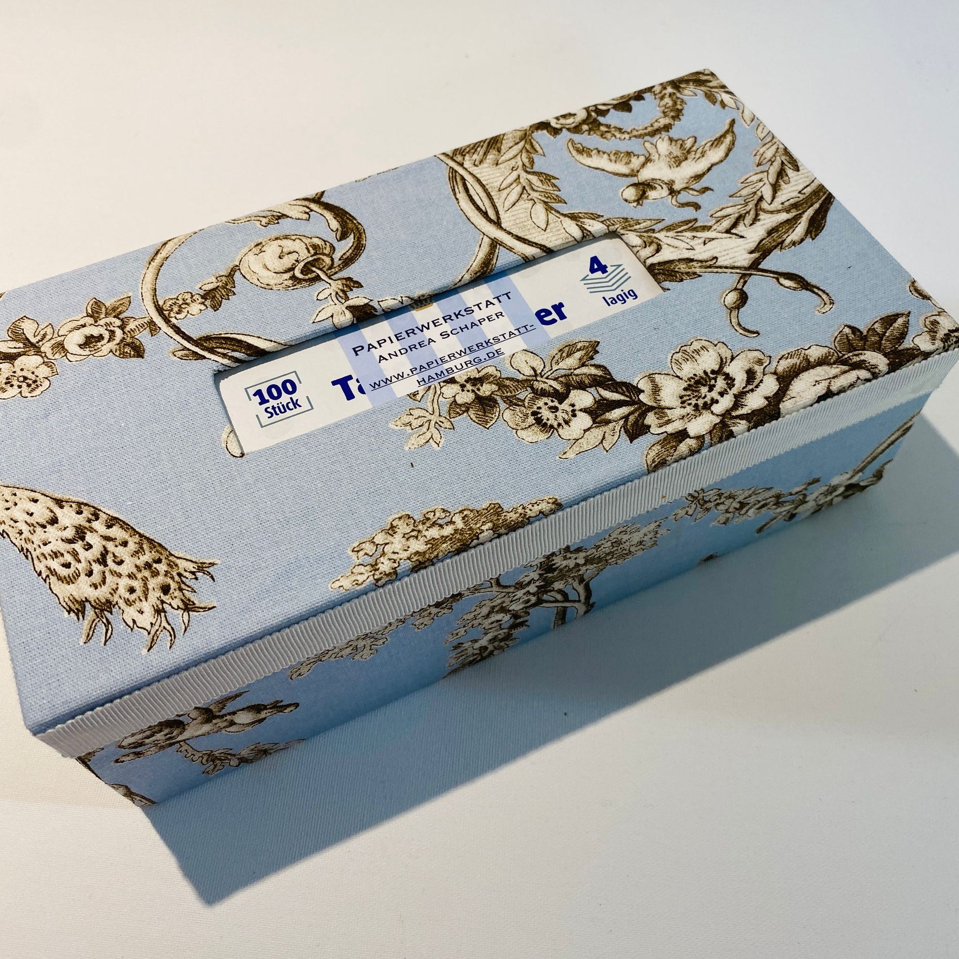 Der klassische Toile de Jouy-Stoff zeigt Engelchen und Blumen vor hellblauem Hintergrund. Praktisch und schön zugleich – ein kleines Kunstwerk für die tägliche Routine. Ein cremefarbens Ripsband läuft um die Box und ist ein hübscher Kontrast.
