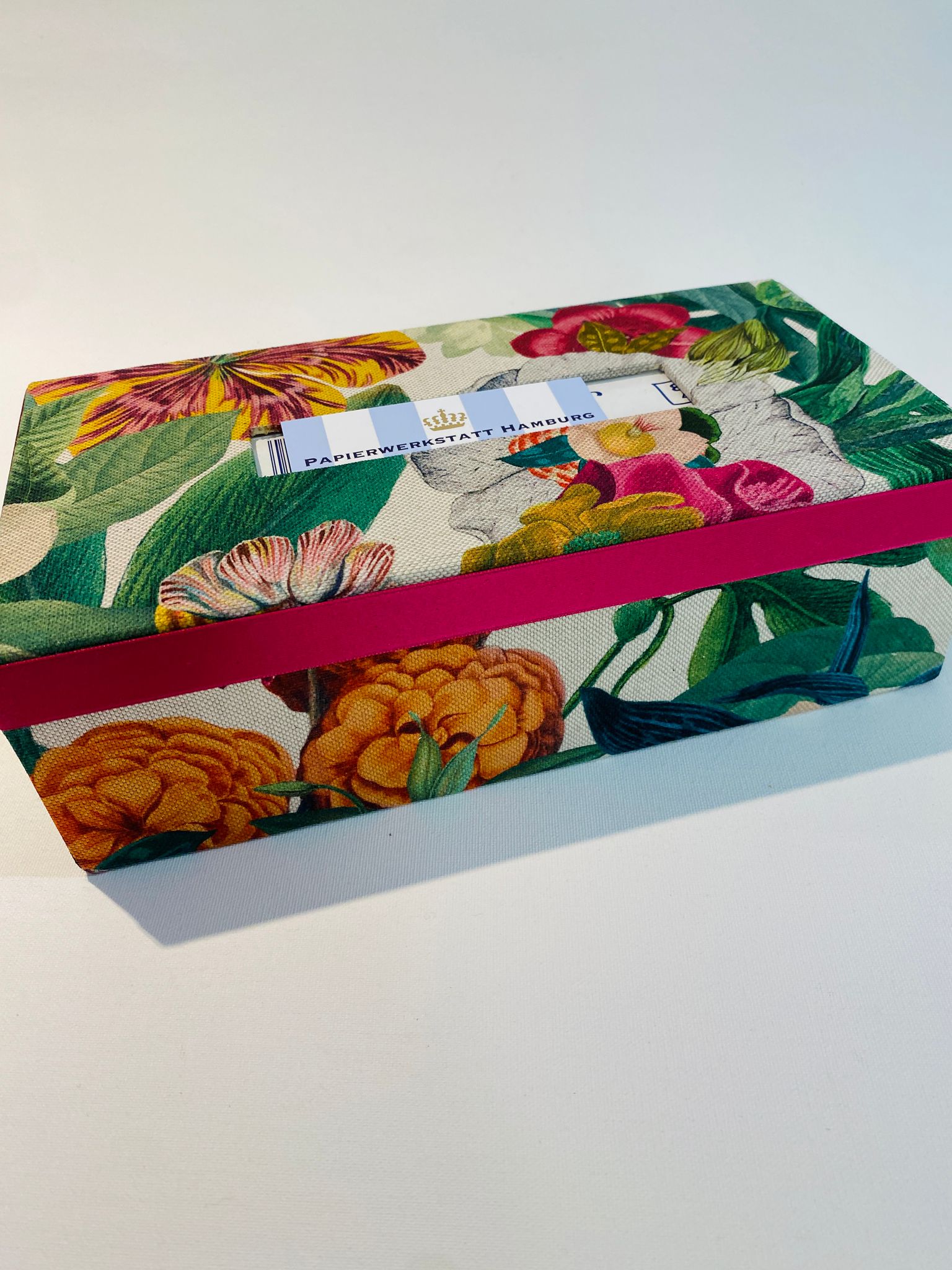 Diese Box aus englischem Blumenstoff stülpt man einfach über die gängigen Boxen aus dem Drogeriemarkt, schon ist sie ein Hingucker. Ein farblich passenden Satinband rund um die Schachtel ist ein hübscher Farbakzent.