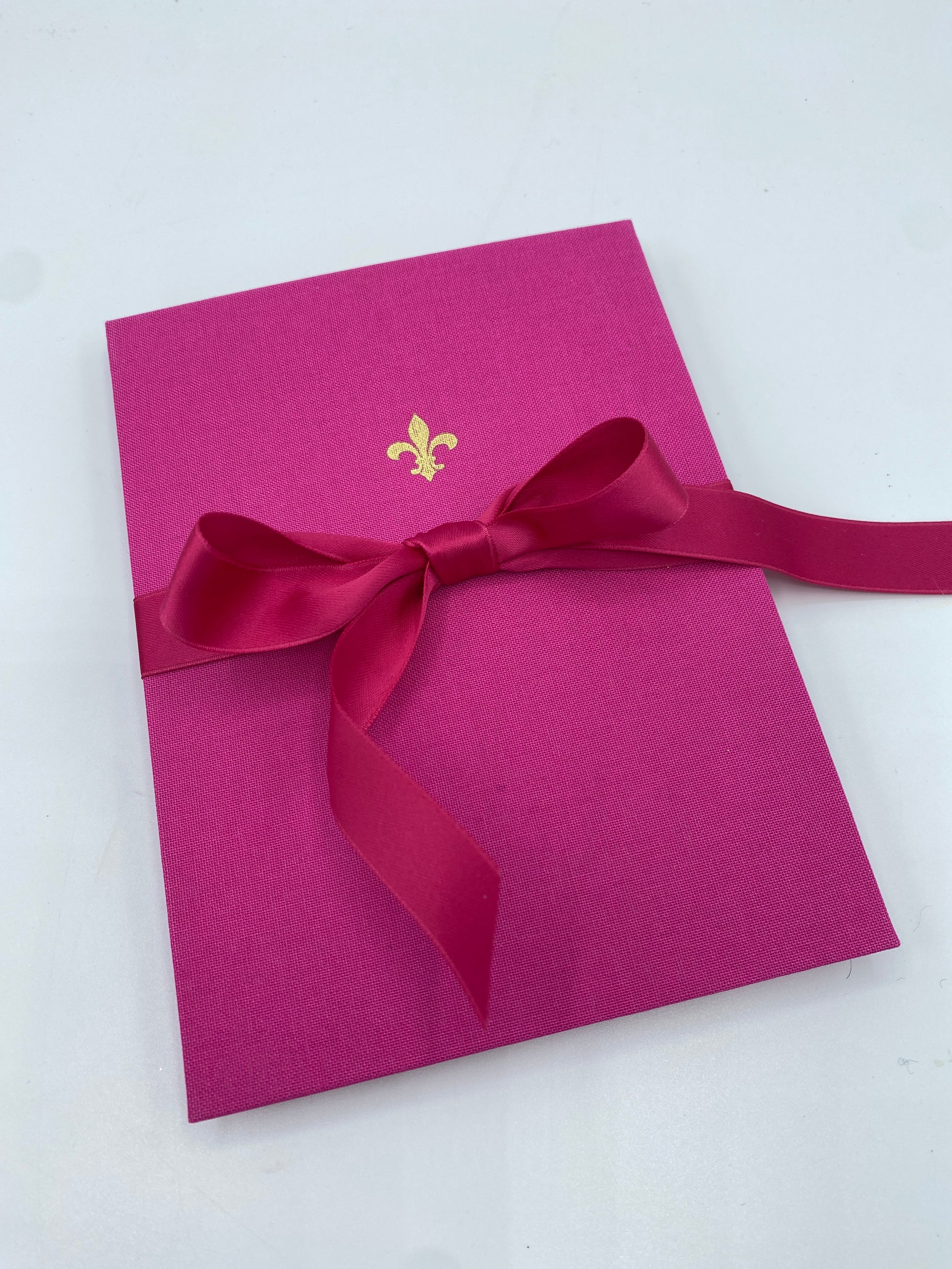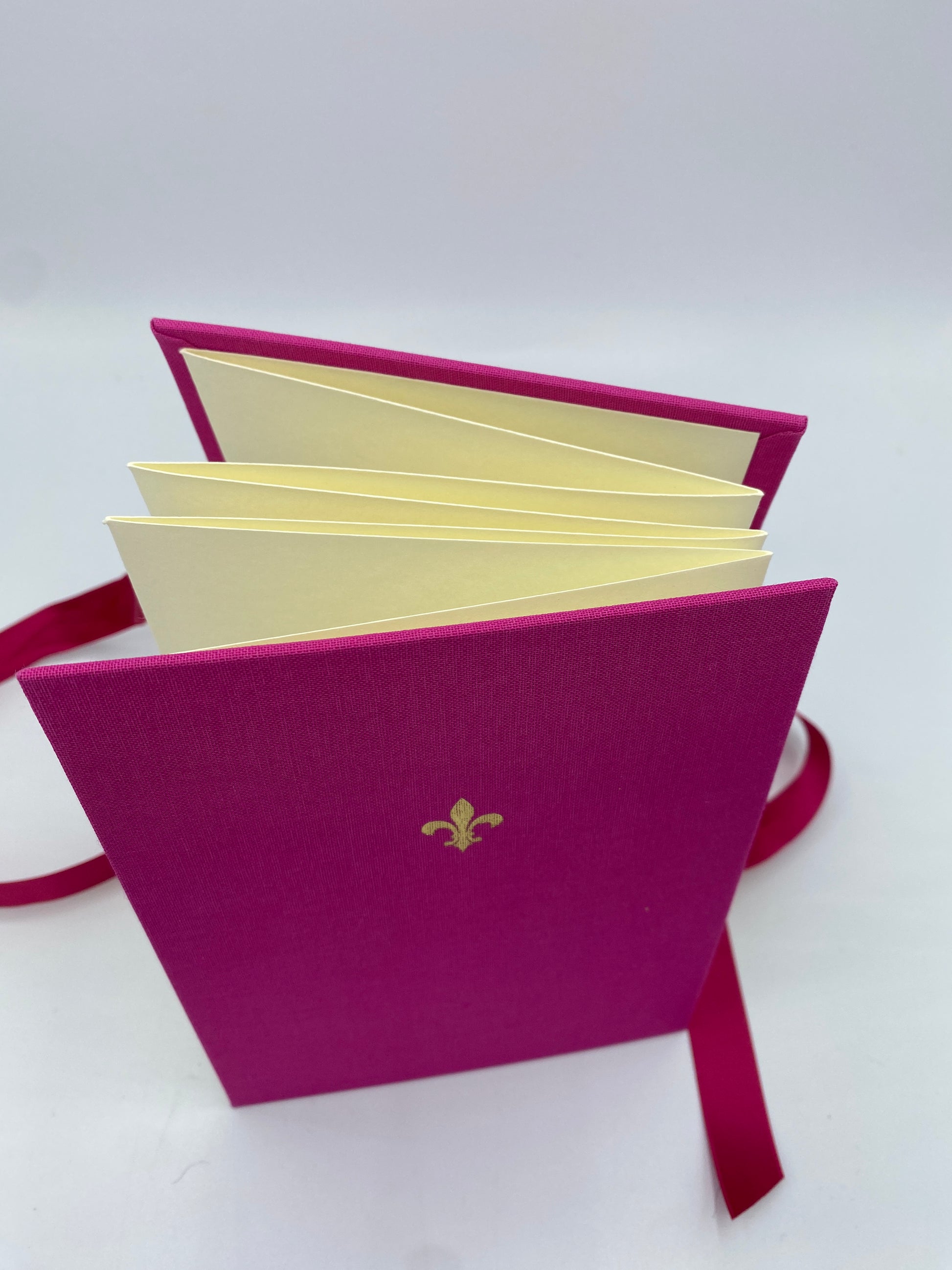 Die französische Lilie ist auf das pinkfarbene Gewebe in gold geprägt, eine farblich passende Schleife verschließt das kleine Büchlein, die Seiten sind in Zieharmonika-Form gefaltet.