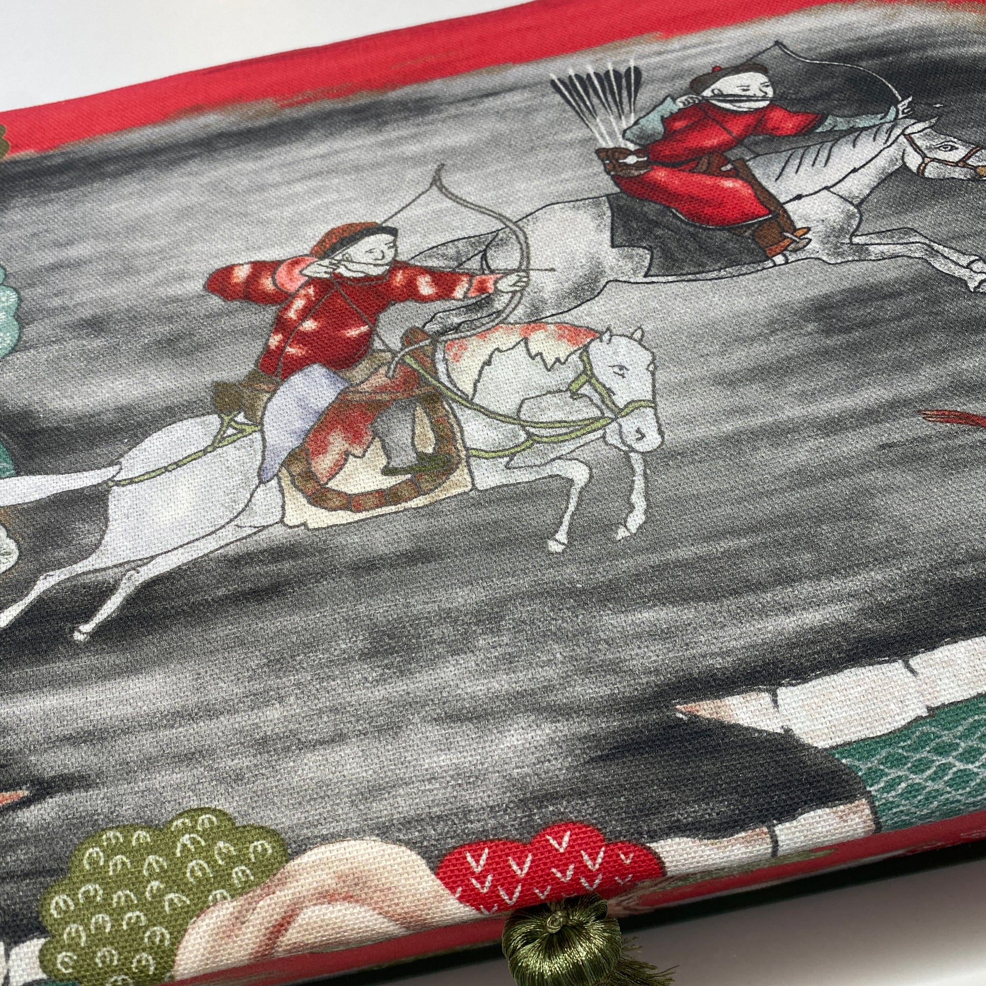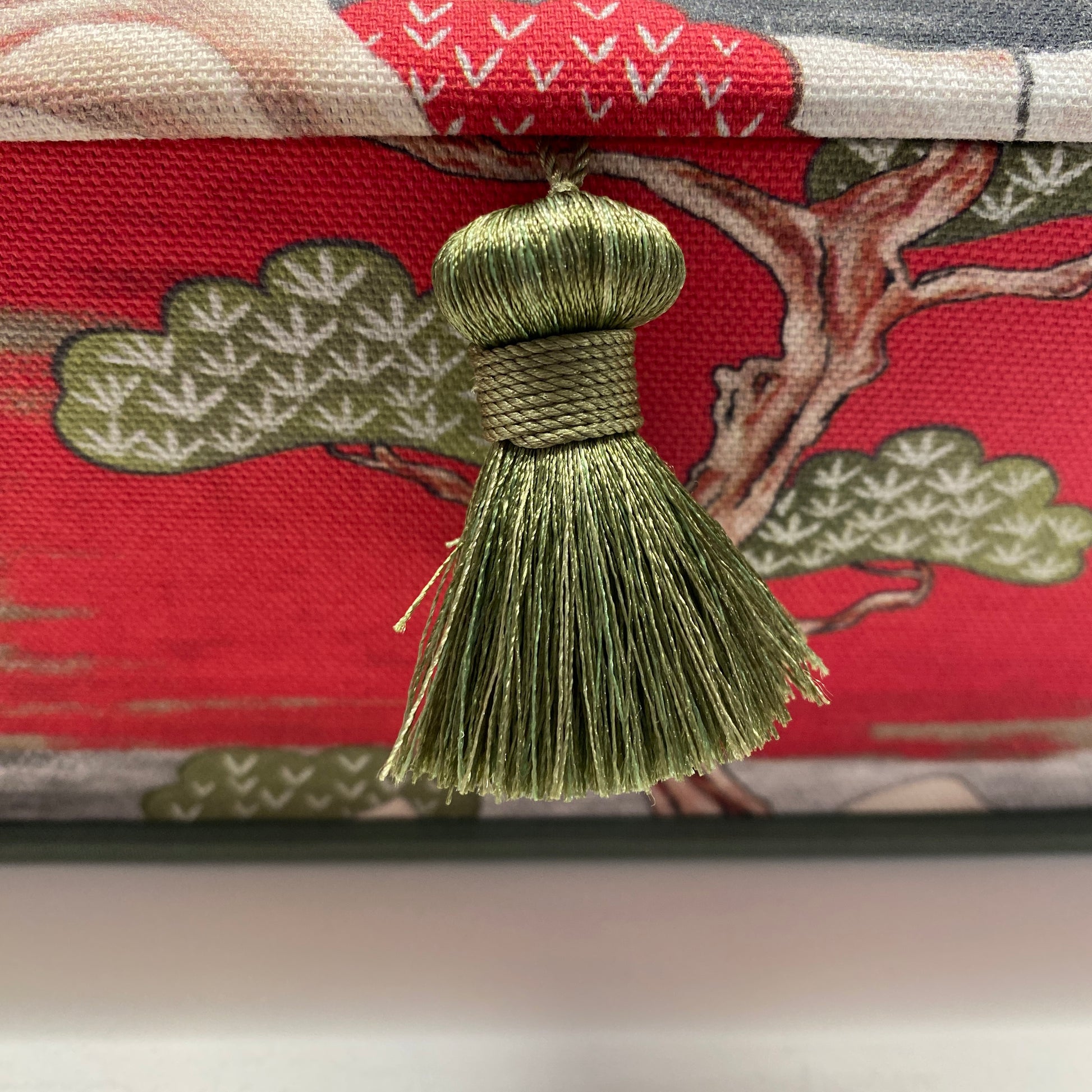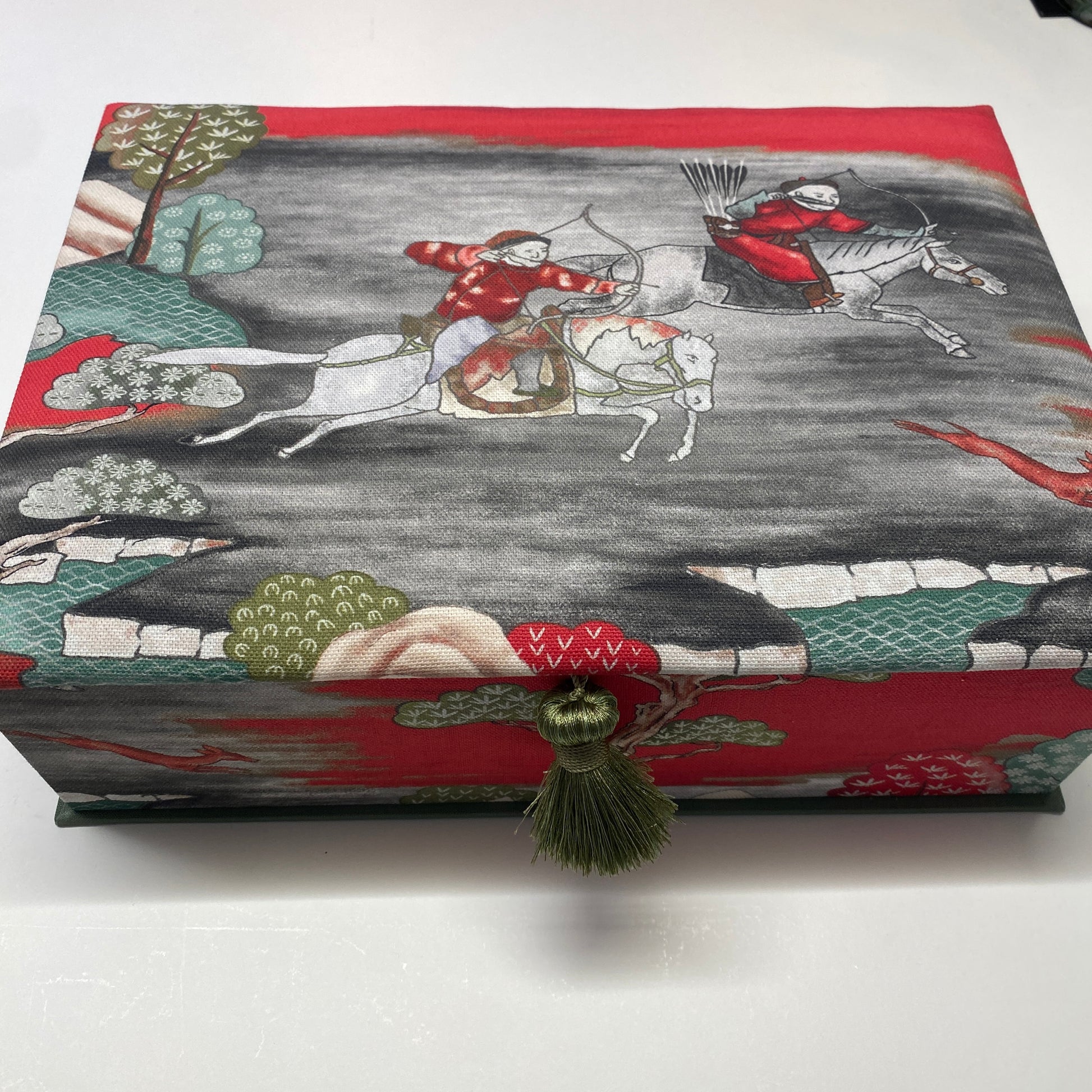 Sie ist mit einem rotem Leinenstoff mit Jagdmotiven bezogen, der Deckel ist leicht gepolstert und innen mit salbeifarbenem Buchleinen gefüttert. Mit einem passenden Quast lässt sich die Box leicht öffnen.