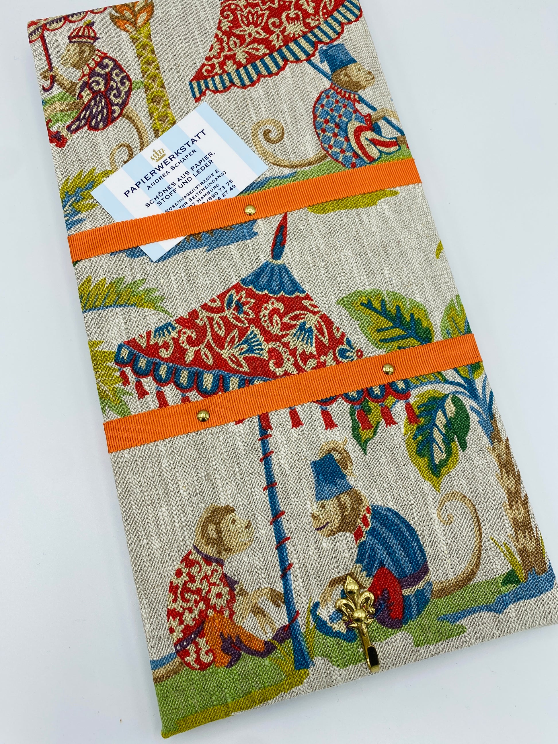 Die kleine Erinnerungshilfe ist 20 x 40 cm groß, es ist aber auch jedes andere Format möglich. Stoff und die Bänder können Sie sich ebenfalls aussuchen. Mit einem oder zwei Haken.