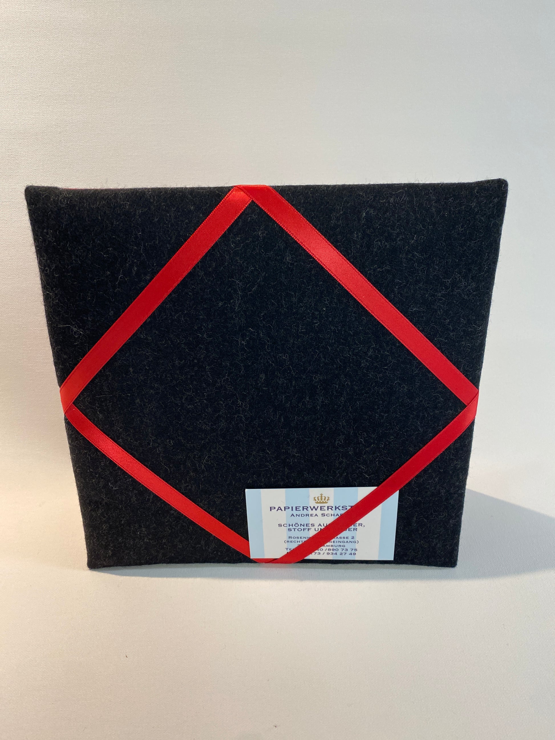 Dieser Steckrahmen aus dunkelgrauem Loden kann als kleines Memoboard benutzt werden oder auch als Bilderrahmen, bei dem man die Fotos schnell wechseln kann. Unter roten Satinbändern und einem Ständer aus passendem Buchbinderleinen sieht das auf jedem Regal schön und dekorativ aus. Der Rahmen ist 22 x 22 cm groß, da hat das Bild Ihrer Liebsten oder auch kleine Erinnerungen genügend Platz